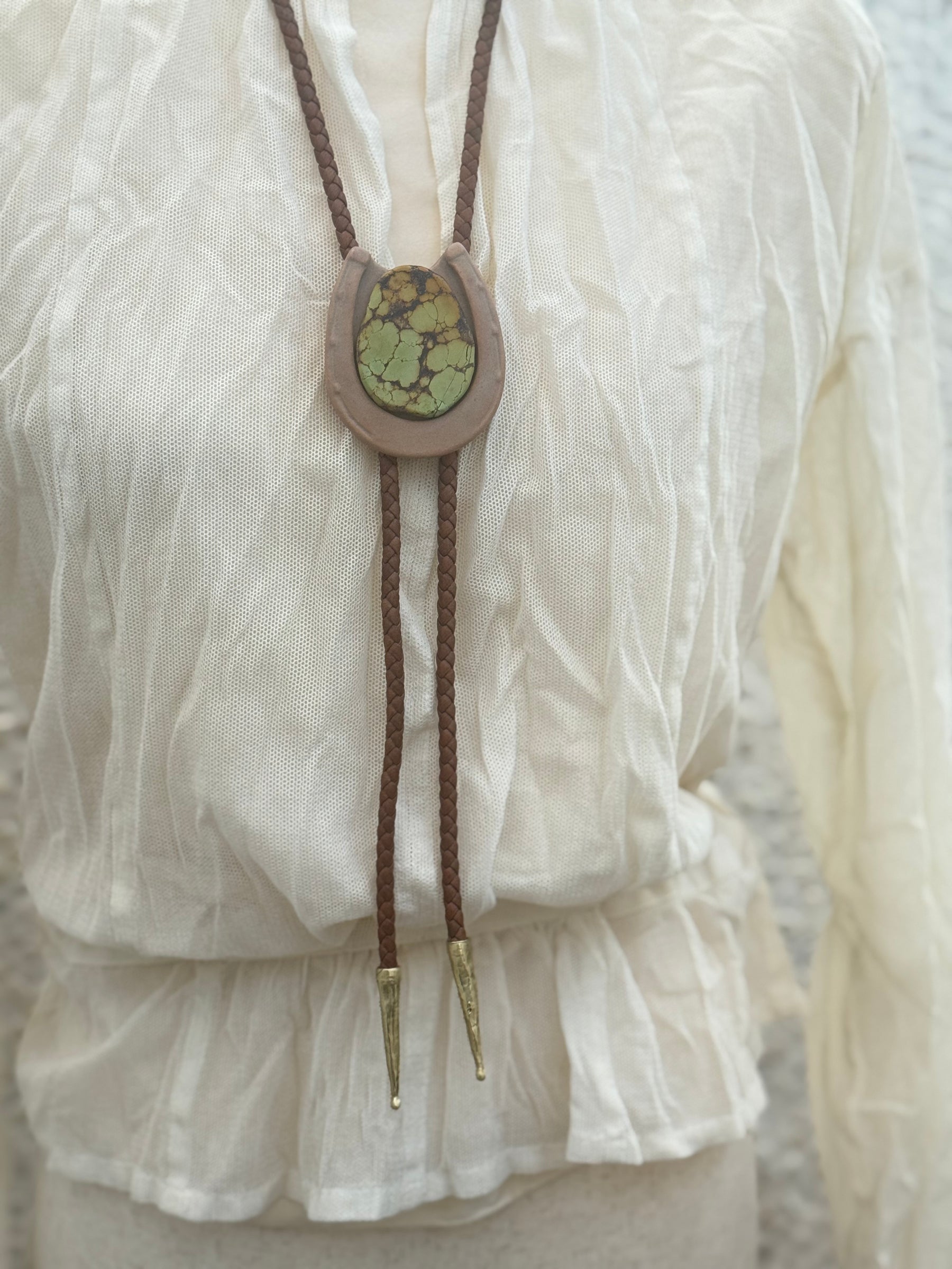 Handcrafted Clay Bolo with natural Cloud Mountain Turquoise and custom cast bronze bolo tips