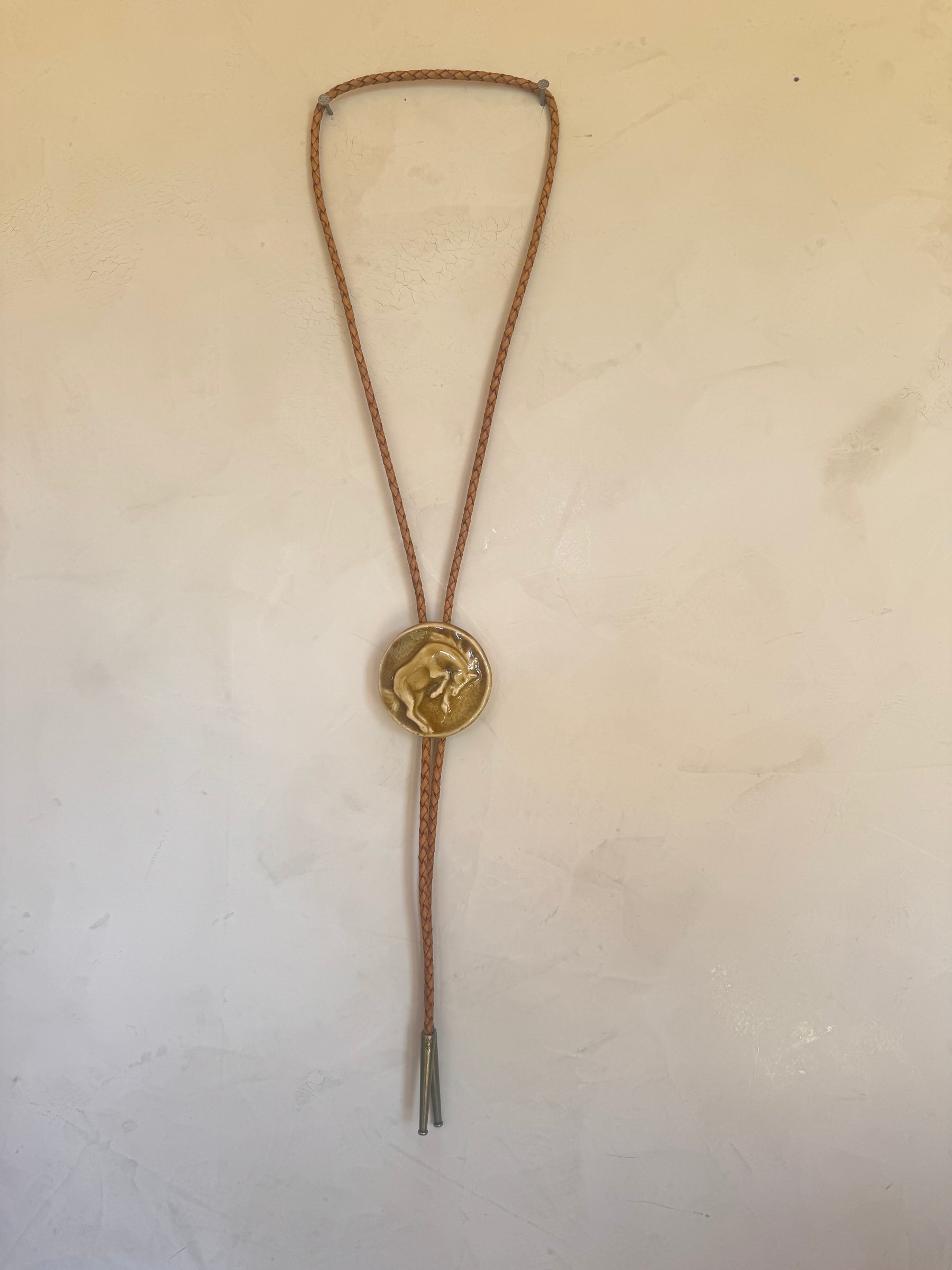 Porcelain and tan leather bolo in amber color with vintage silver, bright silver, vintage bronze, or bright gold tips and easy press adjustable back