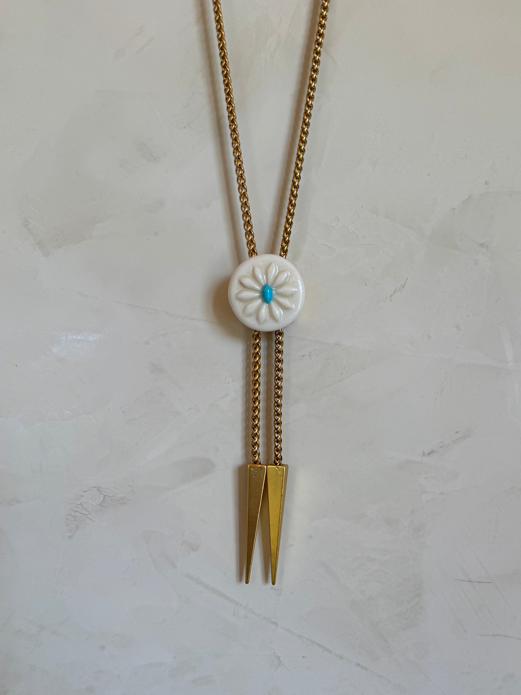 Porcelain flower bolo with Sleeping Beauty Turquoise on a gold chain with gold tips and an easy press gold back