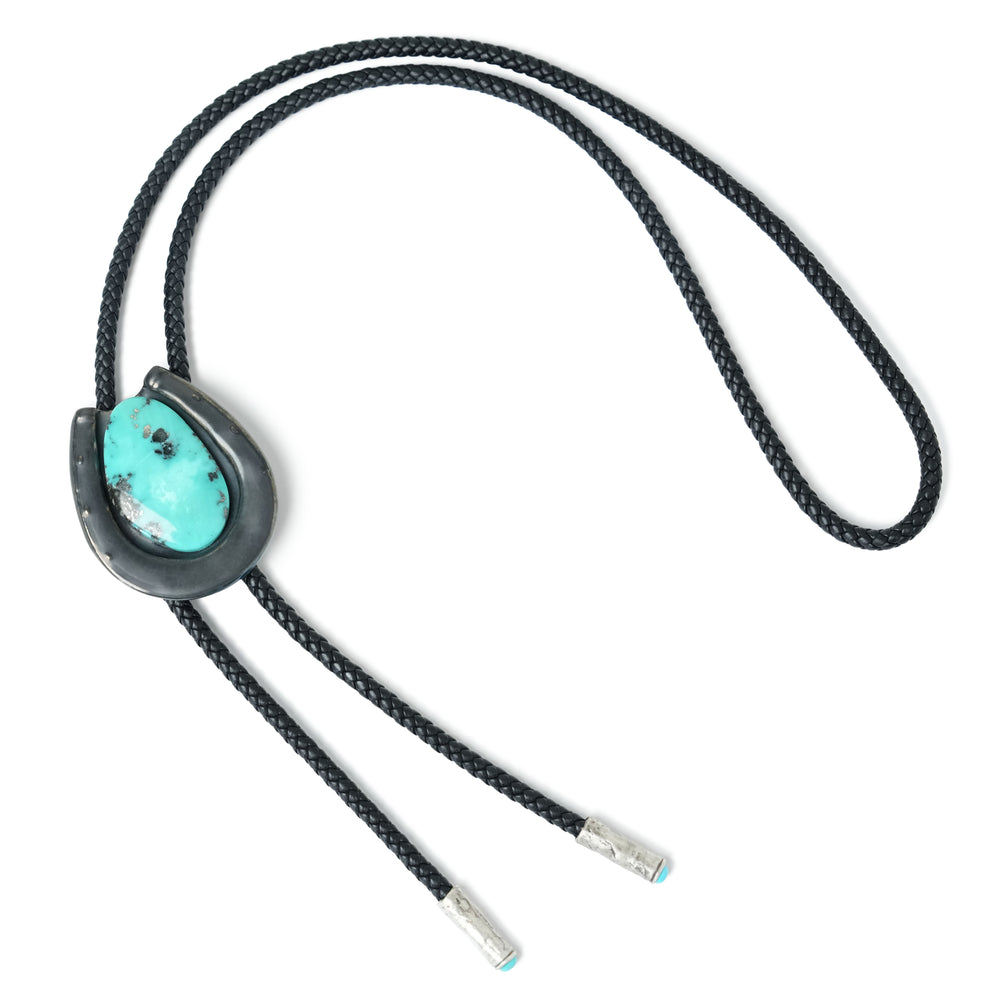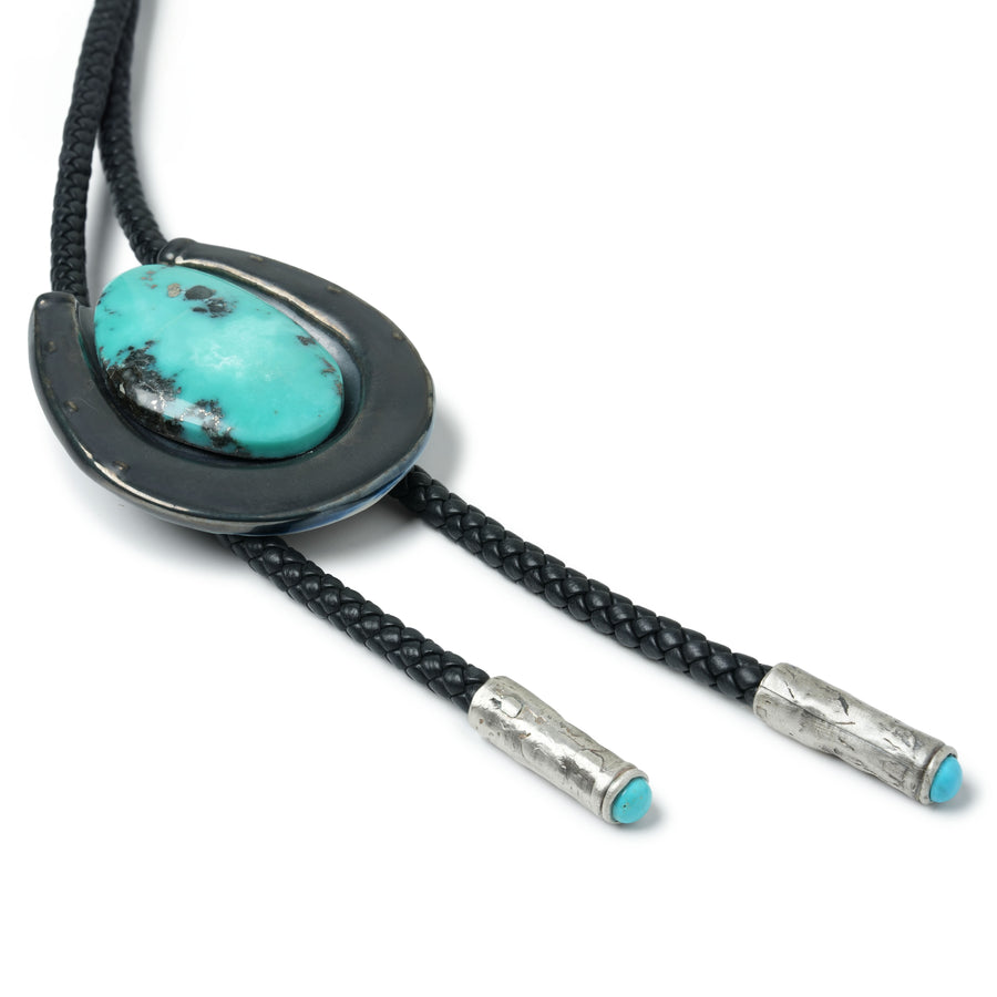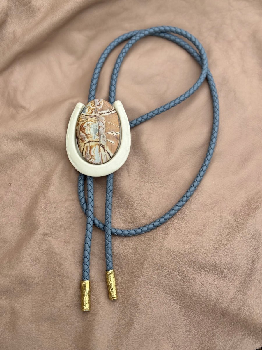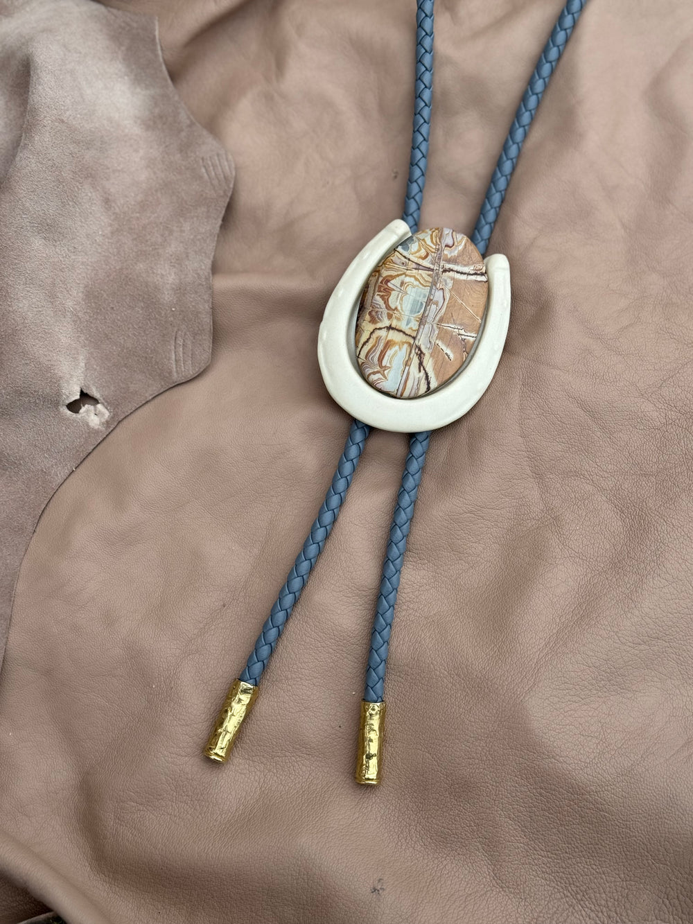 Rare vintage Picture Jasper on clay horseshoe bolo with designer juniper leather and custom bronze tips.