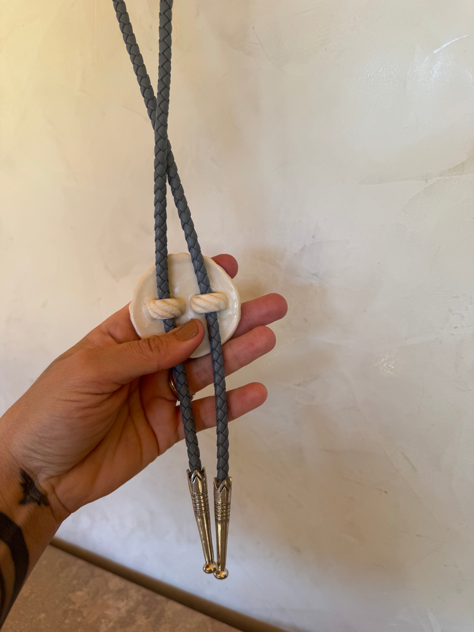 Porcelain bolo in satin bone color with premium juniper leather and silver tips