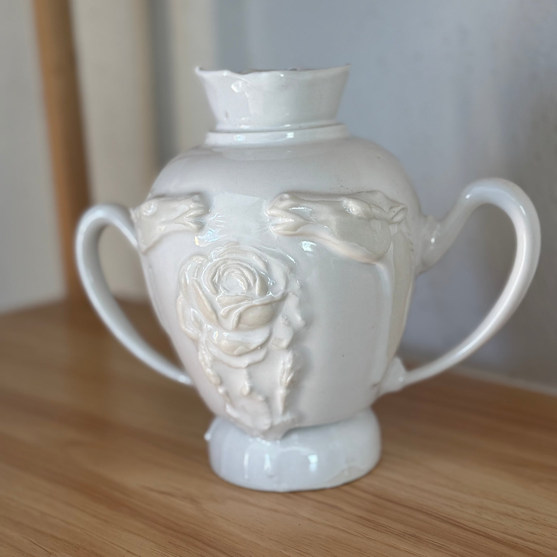 Beautiful porcelain vessel with two horses and a rose